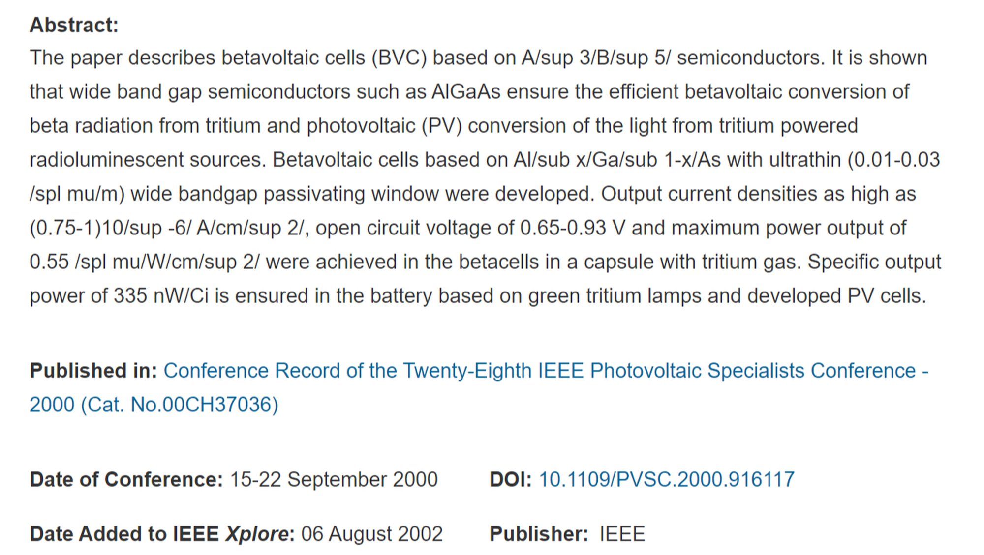 - ^ V.M. Andreev. (2002). Al/Sub X/Ga/Sub 1-X/As Bazlı Trityumla Çalışan Beta Hücreleri. Institute of Electrical and Electronics Engineers (IEEE). | Arşiv Bağlantısı