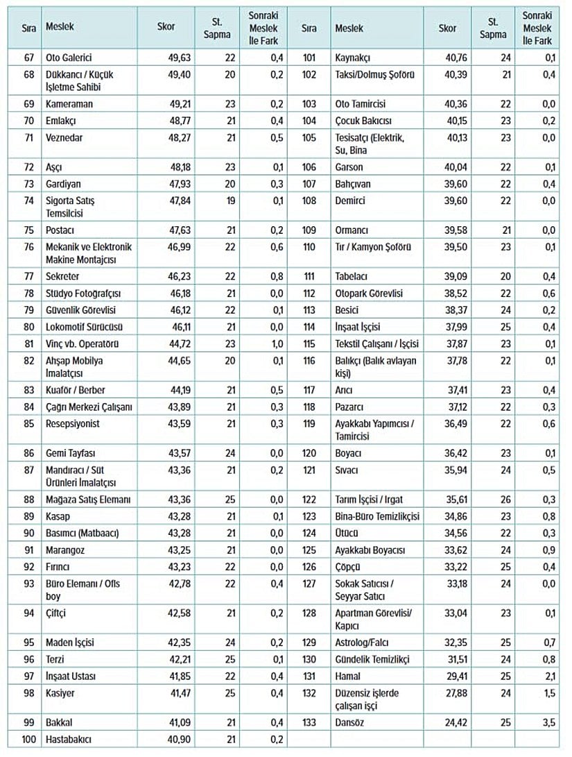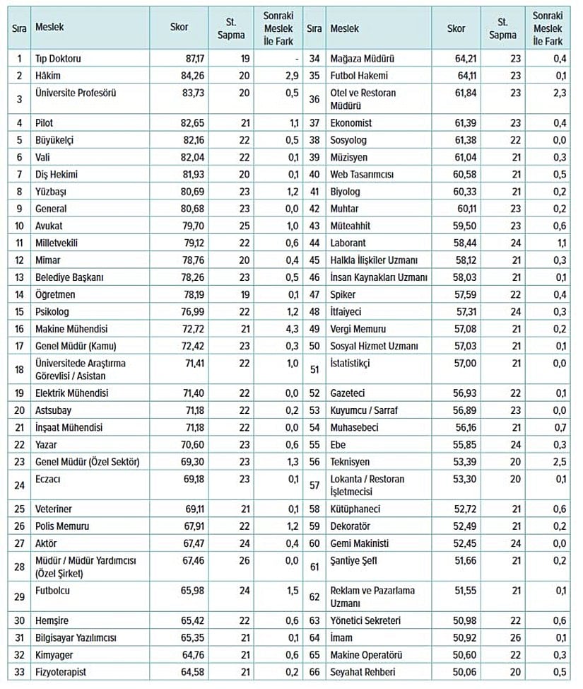 Türkiye'nin en itibarlı ve en itibarsız meslekler tam listesi (mesleki itibar listesi):