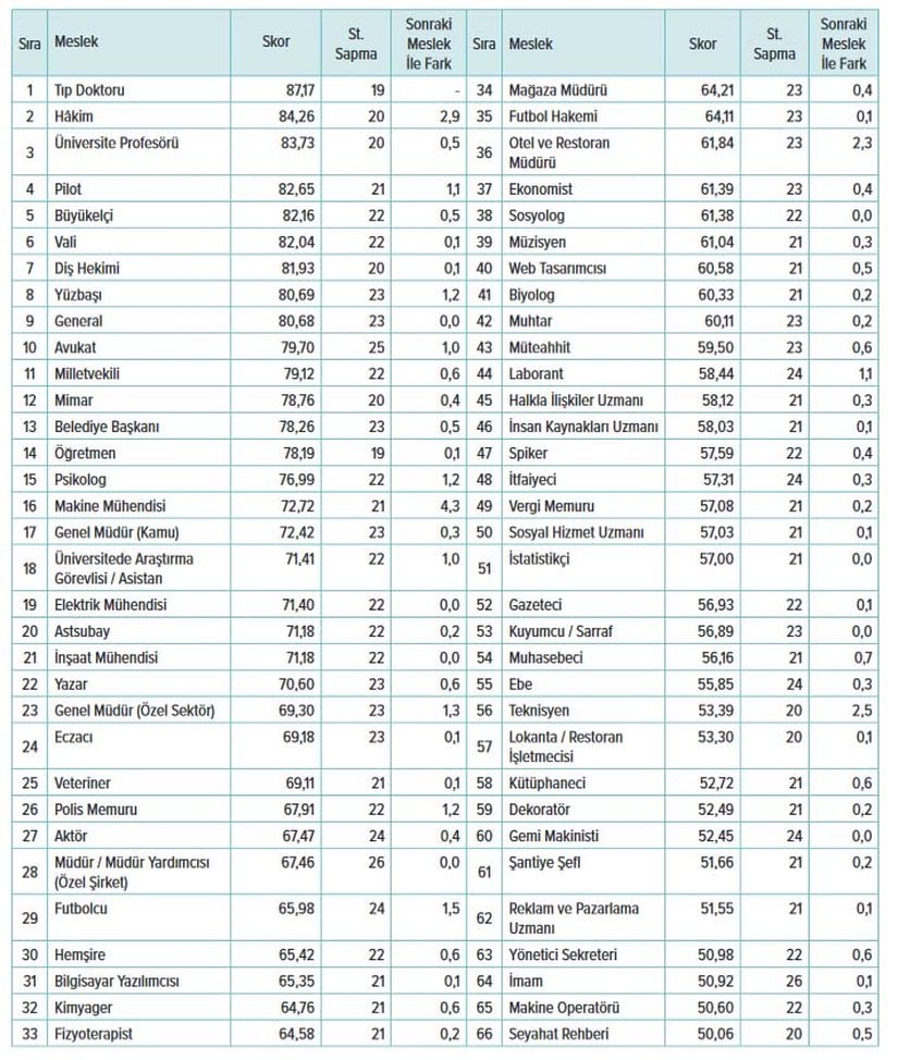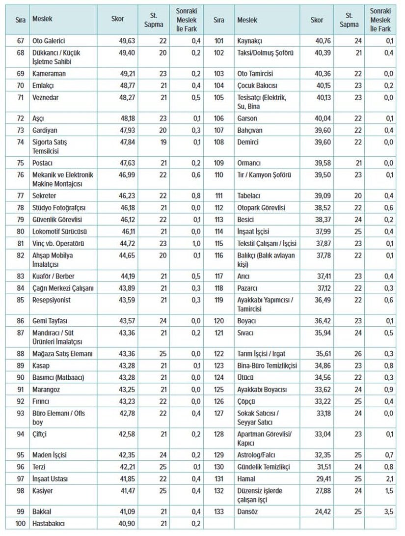 Türkiye'nin en itibarlı ve en itibarsız meslekler tam listesi (mesleki itibar listesi):
