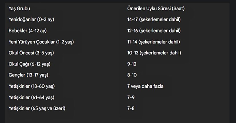 Tablo 1: Yaş Gruplarına Göre Önerilen Uyku Süreleri