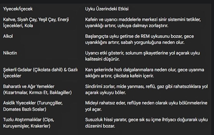 Aşağıdaki tablo, uyku kalitesini olumsuz etkileyen başlıca yiyecek ve içecekleri ve etkilerini özetlemektedir: