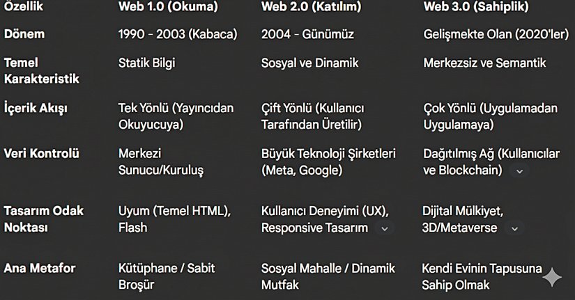 Web, basit bir duvar afişi okuma yerinden (Web 1.0), sosyal bir mahalleye (Web 2.0) ve şimdi de kendi dijital tapumuzu aldığımız merkezsiz bir evrene (Web 3.0) dönüştü. Her aşama, teknolojiyi kullanma biçimimizi ve veriye yaklaşımımızı değiştirdi. Statik duruşlardan, kişiselleşmiş etkileşime, oradan da veri sahipliği vaadine uzanan bu yolculuk devam ediyor ve geleceğin interneti şu anda şekilleniyor.