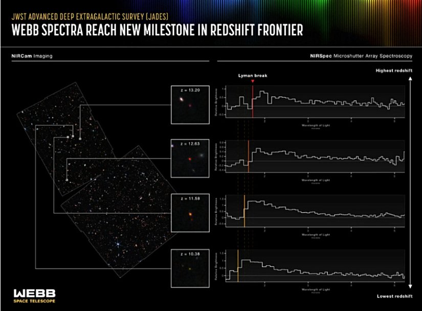 Bilim insanları, Webb teleskobundaki Yüksek Hassasiyetli Yakın-Kızılötesi Spektrograf (NIRSpec) adlı özel bir aleti kullanarak bu uzak nesnelerin yaşını belirledi. Bir spektrometre, ışığı farklı renklere veya bölümlere ayıran bir prizma gibi çalışır. Bu, astronomların incelenen nesnenin fiziksel özelliklerini ve bileşimini incelemesine olanak tanır. Bu durumda, araştırmacılar, ışıkta kırmızıya kayma nedeniyle oluşan özel desenleri aradılar ve bu sayede ışığın -dolayısıyla galaksilerin- ne kadar eski olduğunu doğrulayabildiler.