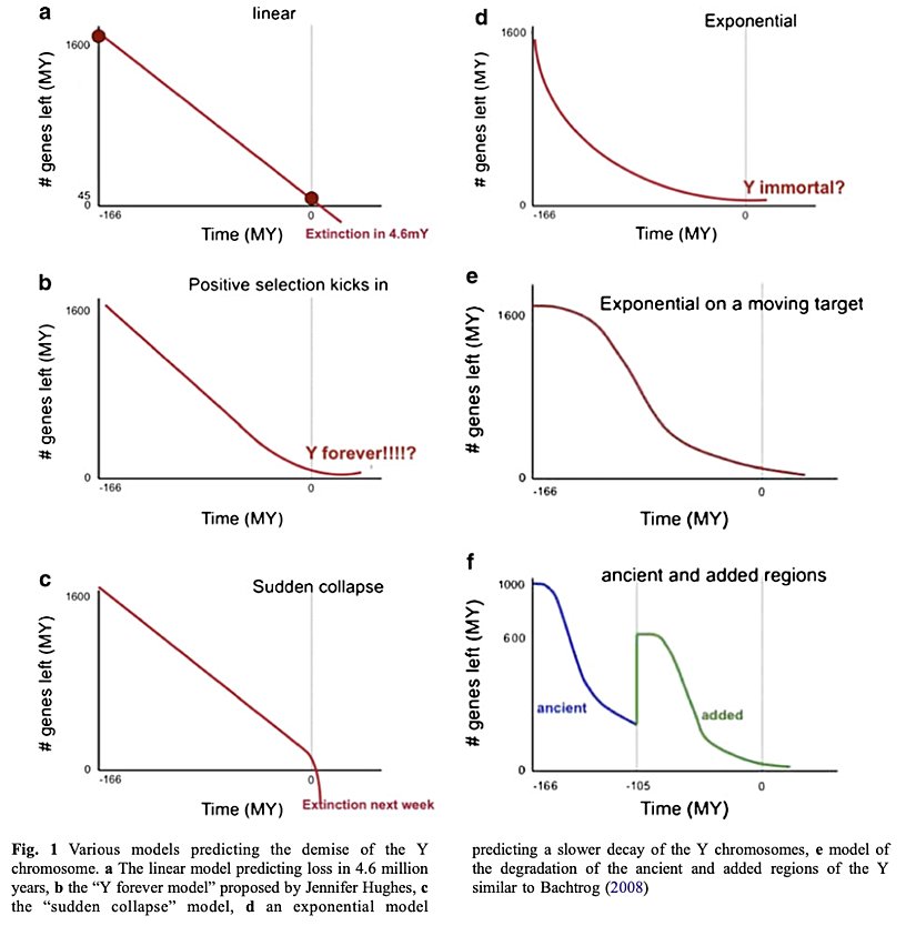 Bu noktada, Y kromozomunun mevcut bozulma (dejenerasyon) hızına bakıldığında ne kadar süre daha varlığını sürdürebileceği sorusu ortaya çıkmaktadır. Jenny, insan X kromozomundaki gen sayısına ilişkin en güncel tahminleri kullanarak atasal Y kromozomunun bir zamanlar yaklaşık 1.700 gen içerdiğini öne sürmüştür. Günümüzde ise bu sayı yalnızca 45’tir. Yalnızca iki referans noktamız bulunduğundan doğrusal bir gen kaybı hızı varsayılırsa, Y kromozomunun yaklaşık 4,6 milyon yıl içinde tamamen ortadan kalkacağı öngörülmektedir (Şekil 1a).