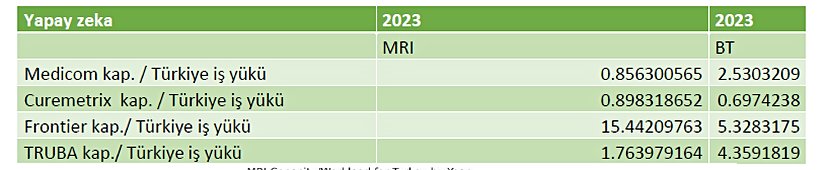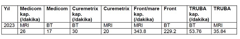Medipol ve Curemetrix, tek başına ulusal yıllık iş yükünü henüz kaldıramazken, TRUBA MRI için %50, BT için %25 kapasite ile yıllık iş yükünü karşılayabiliyor. Frontier, MRI için %6,5, BT için %20 kapasite ile işleme kapasitesine sahiptir.