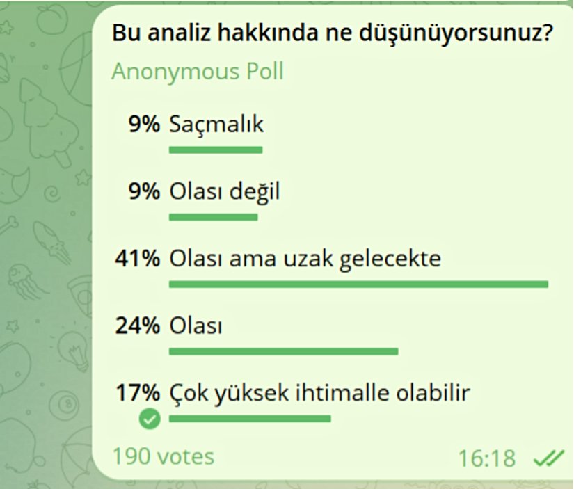 Bugünkü analiz özetini yayınladıktan sonra hekimlere yönelik bir soru yönelttim ve %18'i bunun saçmalık ve imkansız olduğunu belirtti. %41'i bunun uzak bir gelecekte mümkün olabileceğini, %24'ü olası olduğunu ve %17'si büyük ihtimalle gerçekleşeceğini düşünüyor. Analiz özetinde sadece sonuçları paylaştım ve %18'i analizin ne olduğunu sormadan bu projeksiyonu reddetti. Şimdi asıl konumuza dönelim.