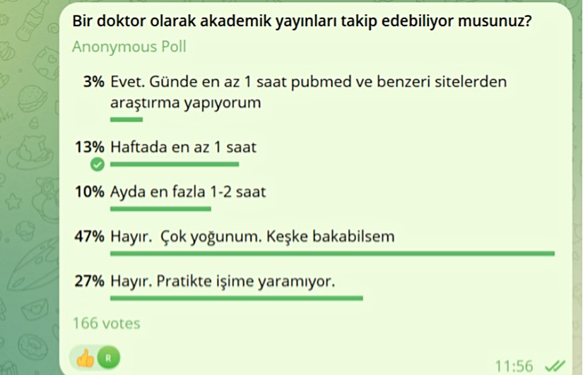 Dördüncü ankette, hekimlerin %16'sı haftada en az bir saat akademik yayın okurken, %10'u ayda birkaç saat okuyor. %47'si iş yoğunluğu nedeniyle takip edemediğini, %27'si ise gerekli olmadığını düşünüyor.