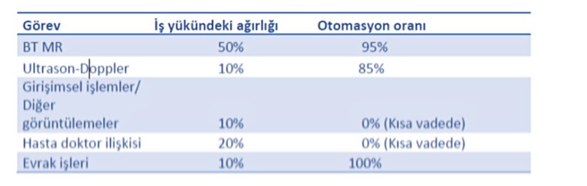 Bu tabloya göre, görüntülemelerin yorumlanması ve evrak işleri, radyoloji iş yükünün %70'ini oluşturmaktadır ve bu alanlar, radyologların çoğunluğu için odak noktasıdır. Gelişen teknoloji sayesinde, özellikle evrak işleri başta olmak üzere, BT, MR, Ultrason ve Doppler gibi alanlarda yapay zeka destekli otomasyon, büyük ölçüde sağlanacaktır. Bu alanlarda çalışacak radyologlara ihtiyaç devam edecek olsa da, gereken radyolog sayısında büyük bir azalma olacaktır.