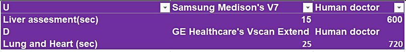 Samsung Medison'ın V7 ve GE Healthcare'ın Vscan Extend [4] adlı yapay zeka destekli donanımları sırasıyla 15 ve 25 saniyede bir ultrason raporunu yüksek doğrulukla yorumlayabiliyor. Buna karşın, bir uzman radyolog ortalama olarak bir ultrason raporunu 600 saniyede, bir doppler raporunu ise 720 saniyede yorumlamaktadır. Bu, yapay zekanın ultrasonda 40 kat, dopplerde ise 29 kat daha hızlı ve yüksek doğrulukla yorum yapabilme kapasitesine sahip olduğunu gösteriyor.