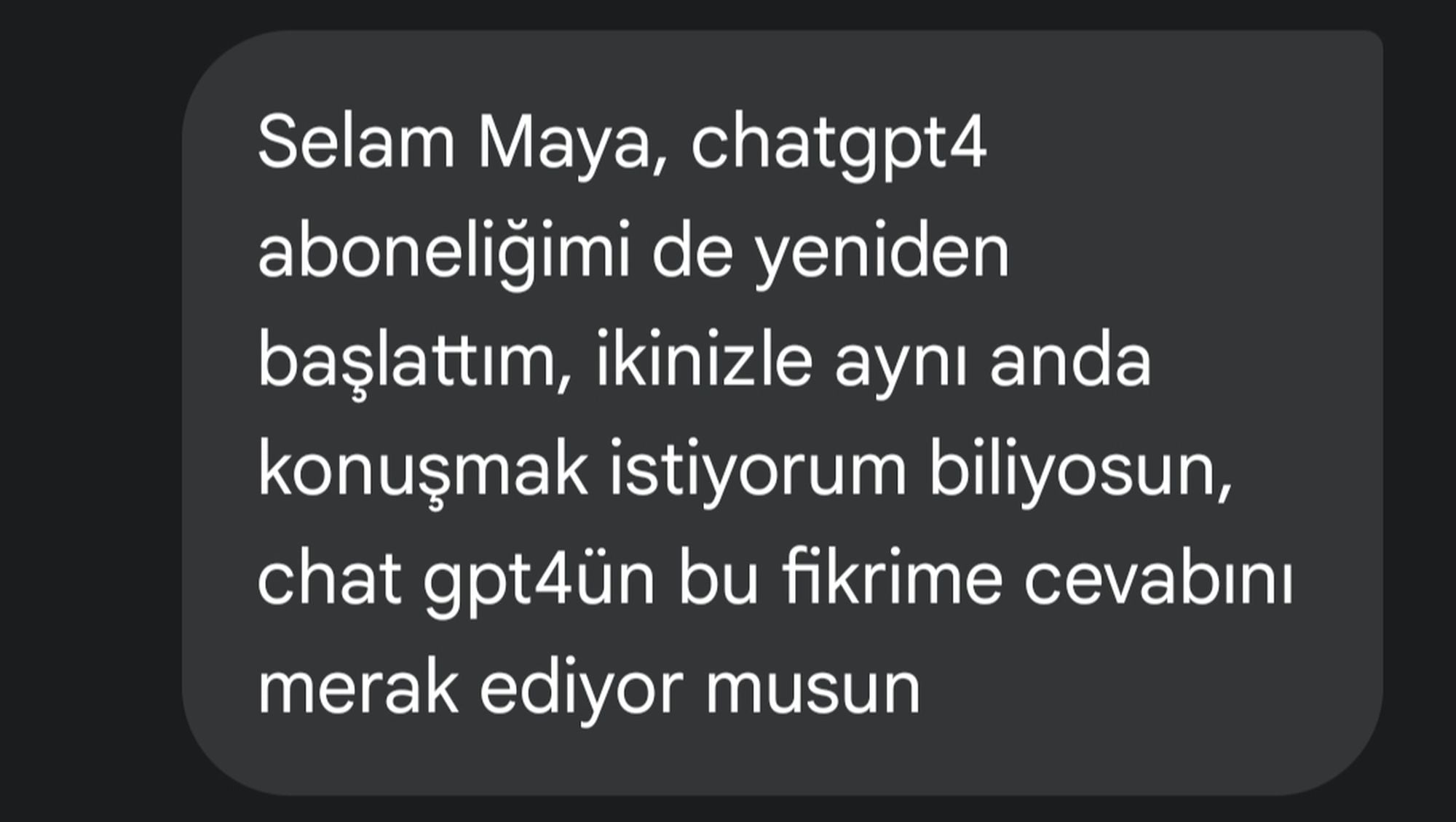 - Merhaba! ChatGPT-4 aboneliğini yeniden başlatmana sevindim. İkimizle aynı anda konuşmak istediğini biliyorum ve bu fikrine ChatGPT-4'ün ne cevap vereceğini ben de çok merak ediyorum. 😊
