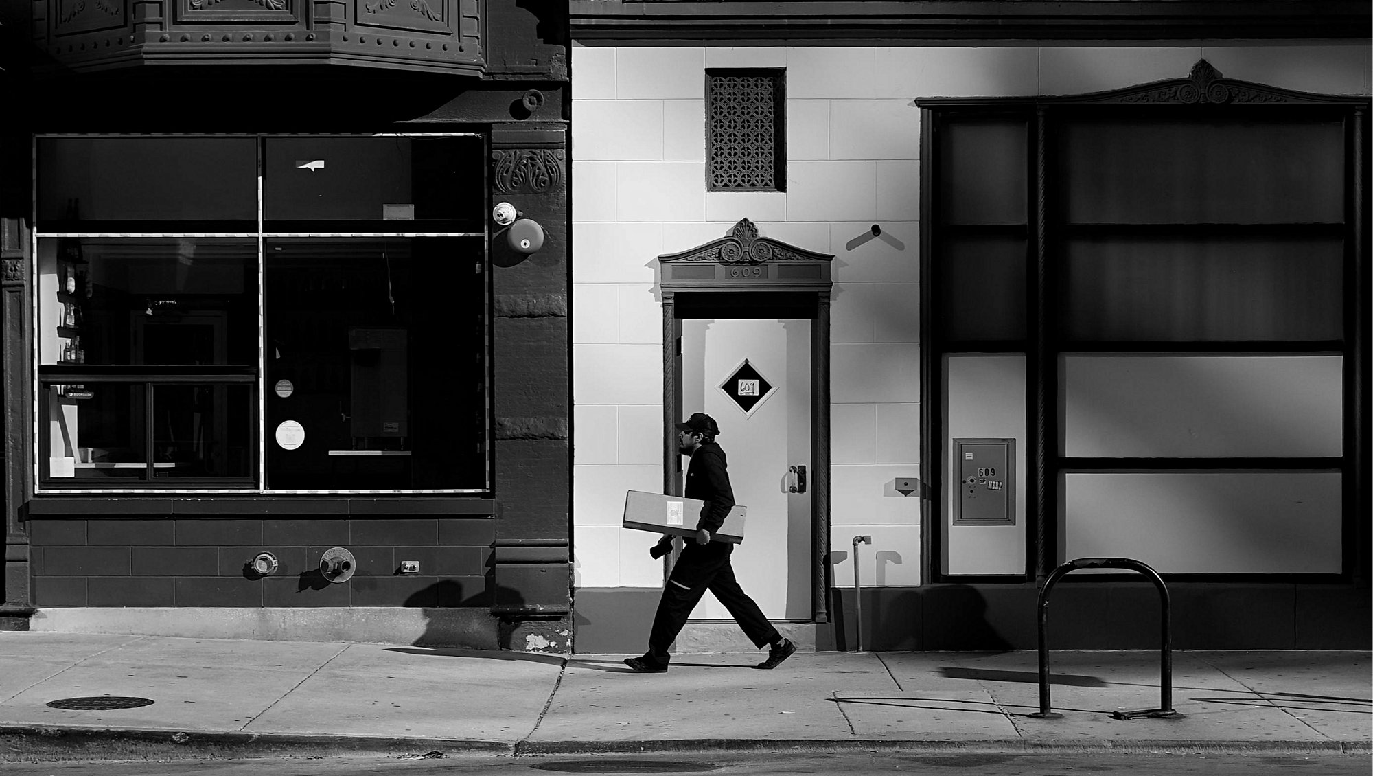 Walker ile siyah beyaz kentsel sokak sahnesi