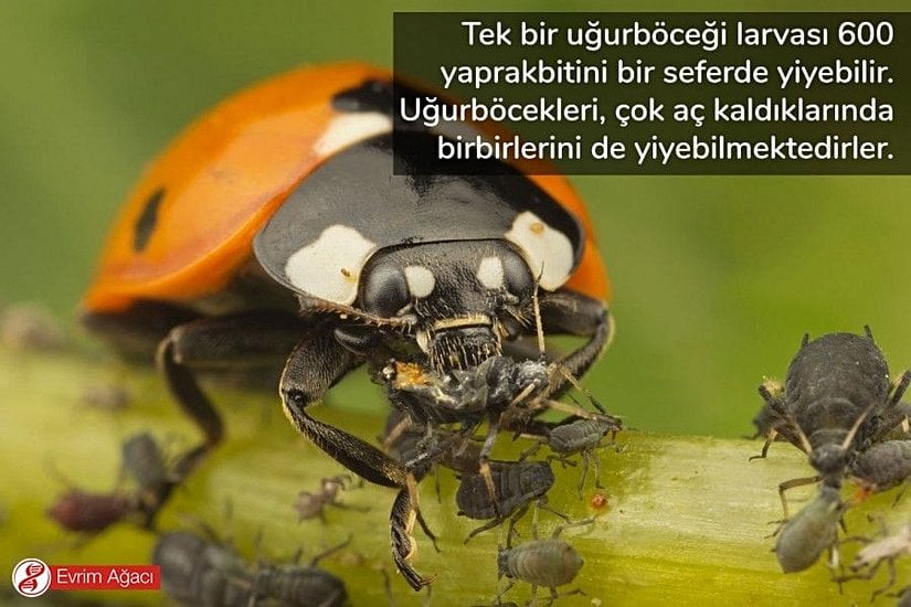 Larval hallerindeyken çok aç olan bu böcekler toplam 600 yaprakbitini yiyebilirler. Ayrıca uğurböceklerinde kanibalizm (yamyamlık) de gözlenmiştir. Aşırı aç kaldıkları durumlarda birbirlerini ve birbirlerinin larvalarını yedikleri tespit edilmiştir.
