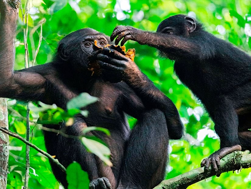 - Bonobolar, meyve ağırlıklı beslenir, alet kullanımı sınırlı olsa da dişiler arasında daha yaygındır; sosyal toleransları yüksektir ve yiyecek paylaşımı akraba olmayan bireyler arasında sık görülür.