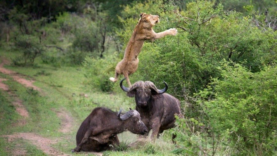 Neyse ki çok geçmeden, saldırıya uğrayan bufalonun olduğu bölgeye sürünün geri kalanı da ulaştı. Ancak aslanlar, bufalo sürüsünden korkmadılar ve avlarını yere indirmeye çalışmayı sürdürdüler. Bu, bufalo sürüsündeki bir diğer bireyi pek memnun etmiş olmayacak ki, olanca gücüyle boynuzlarını aslanlardan birine geçirerek onu birkaç metre havaya fırlattı!