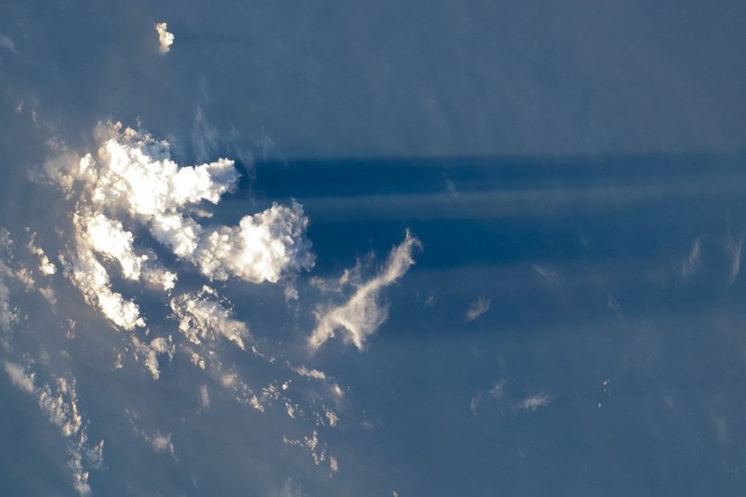 18 Ekim 2011'de Uluslararası Uzay İstasyonu'ndan çekilmiş bu fotoğrafta, Güneş ışınlarının tam da olması gerektiği gibi dümdüz geldiğini görüyoruz; bulutların gölgesi de dümdüz bir şekilde arkaya vuruyor. Ancak eğer ki bu bulutların hemen altında olsak, sanki bu ışınlar etrafa saçılıyormuş gibi algılayacaktır. İşte buna perspektif etkisi denmektedir. Güneş, bulutlardan çok daha uzakta olduğu için, ondan bize gelen ışık ışınları paraleldir. Bu ışık ışınlarına çok yakın konumda olan biz insanlar, bize Güneş'e göre çok daha yakın olan bulutlara baktığımızda, söz konusu ışınlar sanki kırılıyormuş gibi algılarız. Halbuki bu, bizden çok daha uzun olan bir tren rayının iki paralel şeridinin giderek birbirine yaklaşıyor gibi gözükmesinden farksızdır. O raylar birbirine yaklaşmamaktadır (yoksa trenler sürekli kaza yapardı). Benzer şekilde, bulutlardan süzülen ışık da birbirinden uzaklaşmamaktadır.