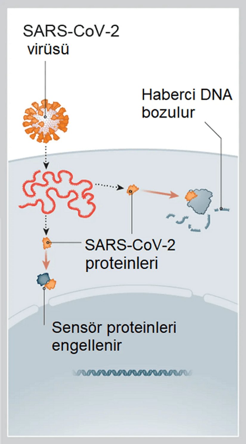 Scientific AmericanTaktik 2: Birkaç SARS-CoV-2 proteininin sensör proteinlerinin hareket etmesini engellediği veya ribozom talimatlarına müdahale ettiği düşünülmektedir.