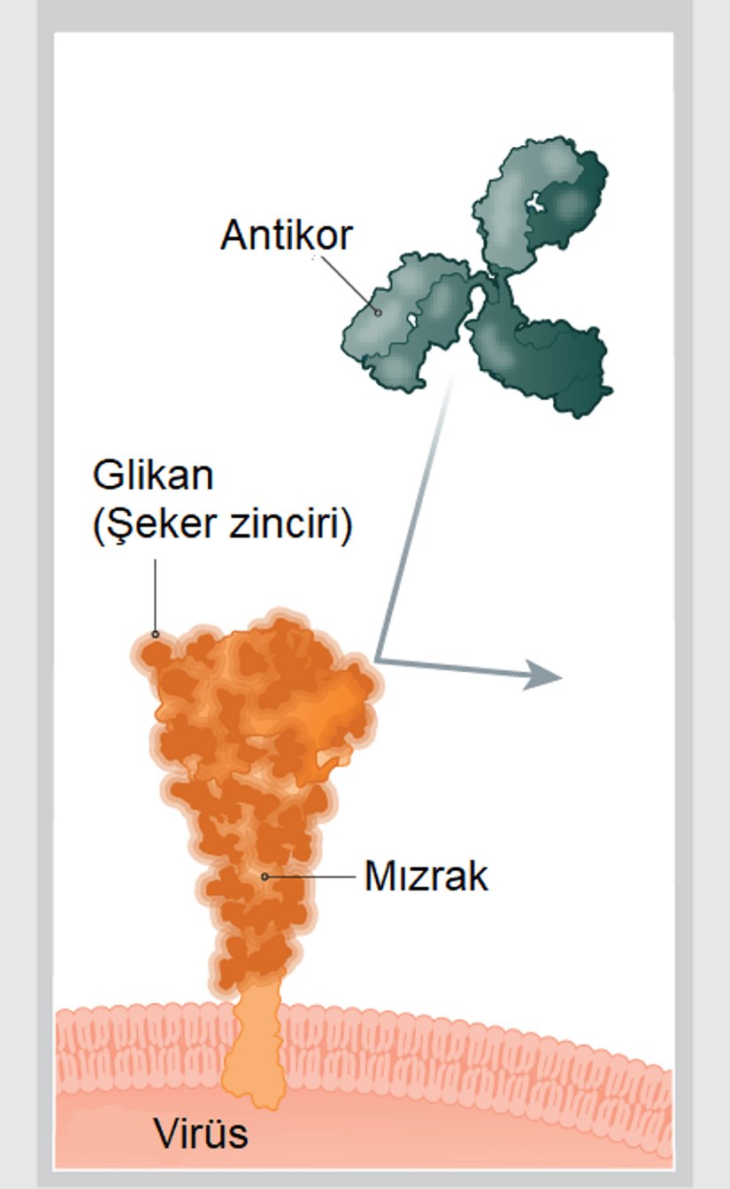 Taktik 1: Virüs şeker molekülleriyle kendini kamufle edebilir. Esnektir ve salınırlar, antikorların virüse yapışmasını engelleyerek nötralize ederler.