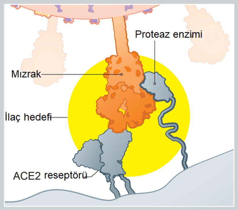 Bir ilaç veya terapötik antikorlar, mızrak proteinine kilitlenebilir ve akciğer hücresinin ACE2 reseptörüne bağlanmasını önleyebilir. Bir ilaç ayrıca proteaz enzimine yapışabilir ve mızrak proteinini kesmesini önleyebilir, böylece virüs hücreyle kaynaşamaz.