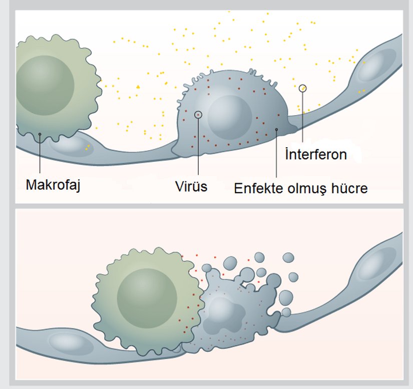 Enfekte bir hücre, virüslerin (kırmızı noktalar) girmesini veya çoğalmasını durdurmaya çalışan moleküller oluşturmak için komşu hücreleri uyaran interferon proteinlerini serbest bırakır. İnterferon ayrıca kan dolaşımındaki makrofajlar gibi virüsleri yutabilecek hücreleri de çağırır. Bu 0-3 gün arasında sürer.