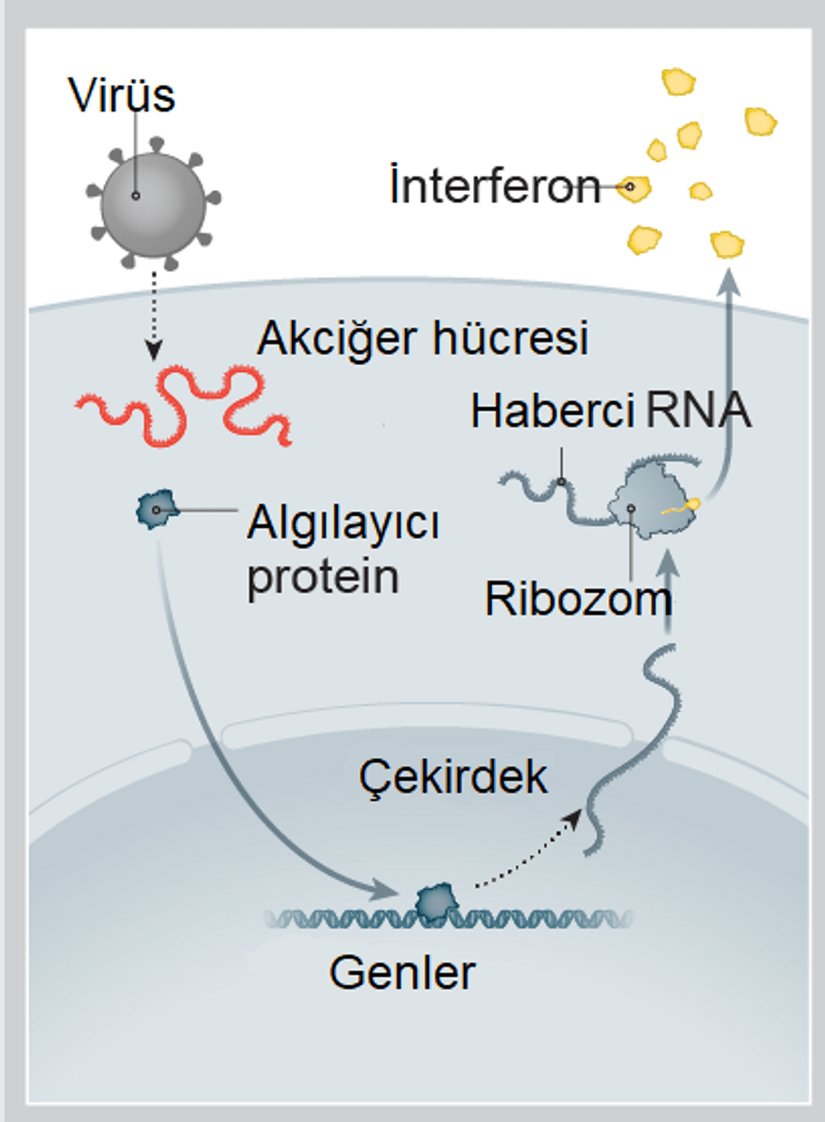 Scientific AmericanNormal olarak, sensör proteinleri gelen virüsleri yabancı olarak tanır ve hücre çekirdeğine haberci RNA molekülleri yapmak için genleri açmasını söyler. Moleküller, bağışıklık sistemi hücrelerini uyarmak üzere hücreden çıkan interferon proteinleri yapmak için ribozomlara talimat verir.