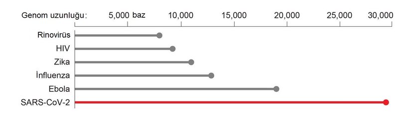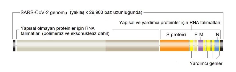SARS-CoV-2 genomu yaklaşık 29.900 baz uzunluğunda bir RNA dizisidir. İnfluenza yaklaşık 13.500 baza sahiptir ve soğuk algınlığına neden olan rinovirüslerin yaklaşık 8.000 bazı vardır. (Bir baz, RNA ve DNA'nın yapı taşları olan bir çift bileşiktir.) Genom çok büyük olduğundan, çoğaltma sırasında virüsü kıracak birçok mutasyon meydana gelebilir ancak SARS-CoV-2 kopyaları düzeltebilir. Bu kalite kontrol, insan hücrelerinde ve DNA virüslerinde yaygındır, ancak RNA virüslerinde oldukça nadirdir. Uzun genom ayrıca tam olarak anlaşılmayan, bazıları bağışıklık sistemimizden kurtulmasına yardımcı olabilecek yardımcı genlere sahiptir.
