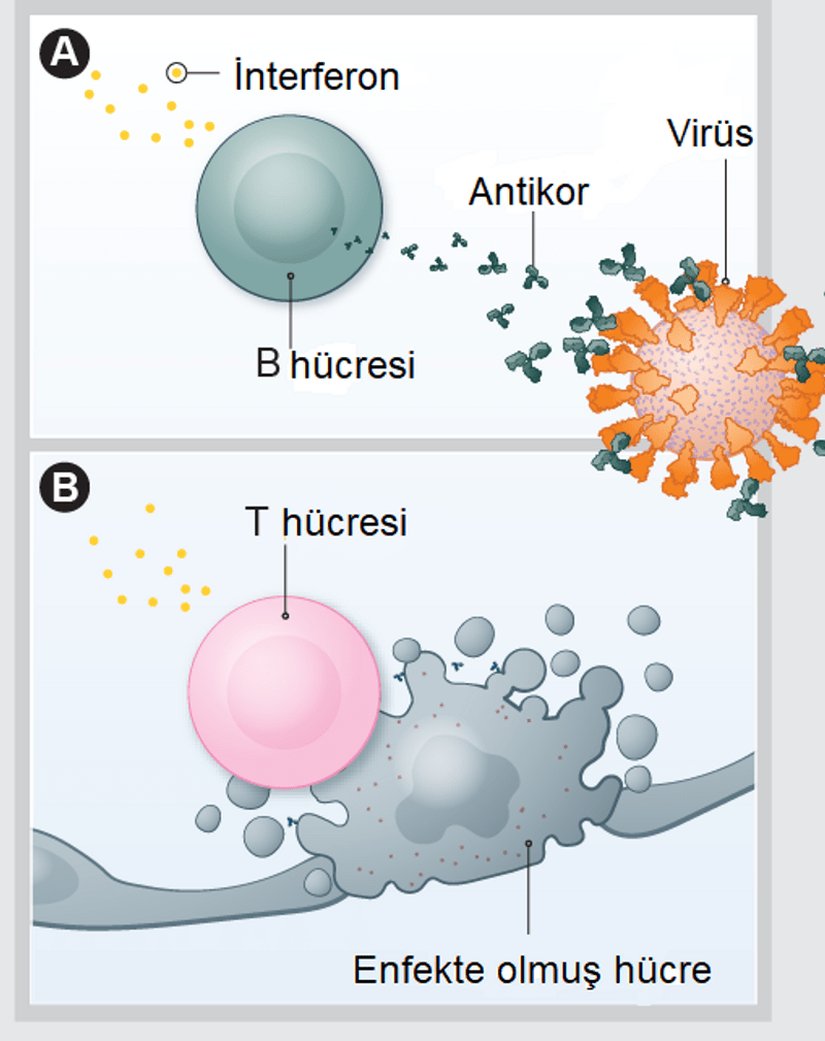 İnterferon ayrıca B hücrelerini uyarır. Mızrak proteininin kısımlarını tanıyabilen ve ona bağlanabilen, mızrak proteinlerinin bir akciğer hücresine tutunmasını önleyebilen “nötralize edici antikorlar” üretir. Interferon ayrıca virüsleri yok edebilen ve içindeki virüsler çoğalmadan önce enfekte olmuş hücreleri öldürebilen T hücrelerini toplar. Bazı B ve T hücreleri, virüsün gelecekteki bir istilasını hızlı bir şekilde tanımlayabilen ve bunlarla savaşabilen hafıza hücreleri haline gelir. Bu 6–11 gün arası sürer.