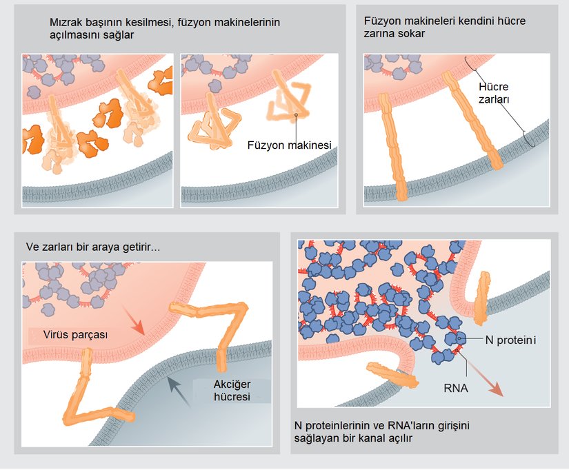 Virüs, mızrak gövdesinin sıkıştırılmış bir parçası olan füzyon makinelerini yay gibi açarak serbest bırakır. Virüs ve akciğer hücre zarları kaynaşır. Mızrak başının kesilmesi, füzyon makinelerinin açılmasını sağlar. Bu işlem yaklaşık 10 dakika sürer.