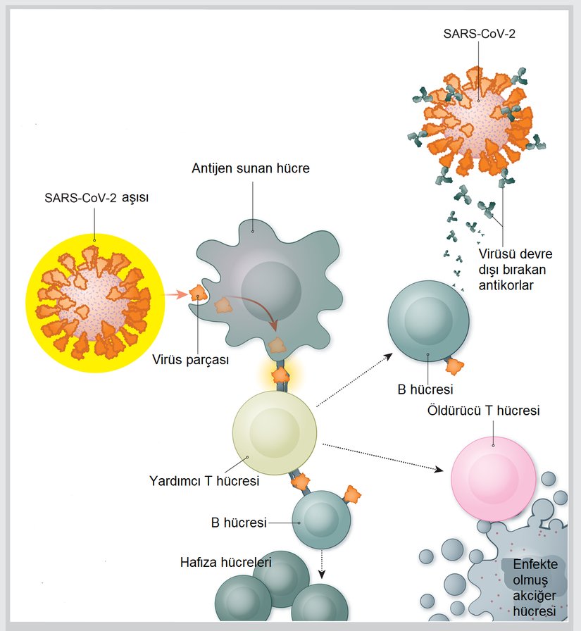 Antikorun Hazırlanması: SARS-CoV-2 virüsünün aşı versiyonu, gerçek virüse ait antijen adı verilen çeşitli moleküller sunar. Antijen sunan hücreler onları yakalar ve yardımcı T hücrelerini ve B hücrelerini sağlar.