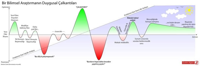 Bilimsel bir araştırma yapmak, bilime yeni bir şeyler katmak zordur. Çok zordur. Çok ama çok zordur. Bu süreçte bilim insanının hayatında çok şey olur, çok şey değişir, duygulara etki eden birçok olay yaşanır. Ancak araştırmanın nereye gittiği ve o yöne doğru nasıl gittiği bilim insanının her gün gündemindedir. Bu yolculukta durmaksızın bir o yana bir bu yana giden duygusal çalkantılar, birçok bilim insanının başından benzer şekillerde geçer. Bu harika çizimde, bu çalkantıları ve nedenlerini görüyoruz.