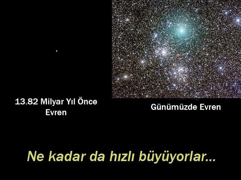 Bunu şöyle düşünebilirsiniz: Büyük Patlama, uzay içinde yaşanmadı. Zaten Büyük Patlama olayı sırasında üretilmeye başlanan şey uzayın kendisiydi! Dolayısıyla Evren, uzay içinde genişlemeye de başlamadı. Uzay tüm yönlerde genişleyerek oluşmaya başladı ve bizler, şu anda da o genişleyen dokunun içinde bulunan ürünleriz.