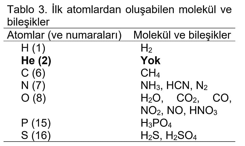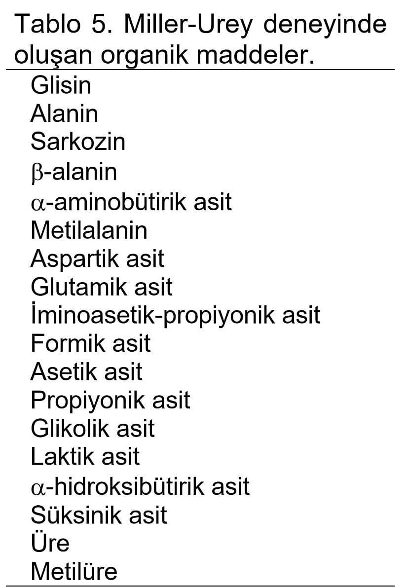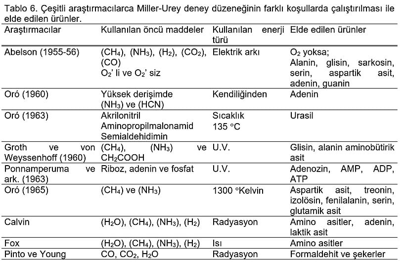 Miller ve Urey deneyi daha sonraki yıllarda birçok kereler ve çok değişik koşullarda yinelenir ve her deney sonunda çok çeşitli tipte organik ve inorganik yapıda basit bileşiğin oluştuğu saptanır. Bunlar içinde, çeşitli aldehitler (örneğin adenin ve urasil’in öncülü formaldehit de bunlar arasındadır), hidrojen siyanid, amino asitler (işlem sırasında canlının yapısında bulunmayan “D” amino asit izomerleri de sentezlenir), çeşitli nükleotidler (adenin bazı kolaylıkla oluşmaktadır), tioesterler, porfirinler ve yağ asitleri yer alır (Tablo 6). Glisin ve alanin gibi en basit yapılı amino asitlerin sentez edilmesi, buna karşılık lisin gibi sentezi zor olanların oluşan ürünler arasında yer almaması sürecin kimyasal kurallara uygun şekilde işlediğini gösterir. Fakat tüm bu maddelerin ancak ve ancak oksijen yokluğunda oluşabildiğini anımsatmak gerekir.