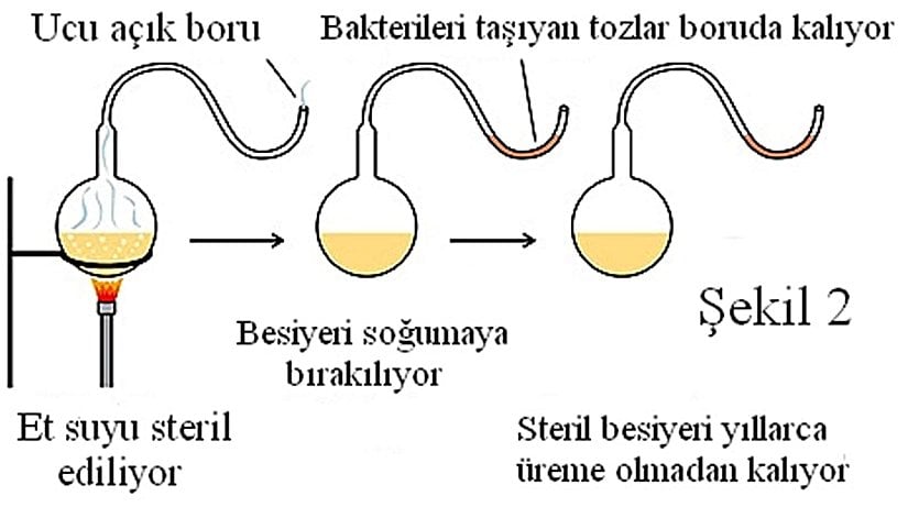 Pasteur, Spallanzani’nin 1765’de yaptığı deneyleri 1861’de yani neredeyse 100 yıl sonra yeniden ele alır. Yaptığı ilk grup deneylerde, kaynatılmış olsa da hava ve tozla temas eden et suyunda mikroorganizmaların ürediğini ama tersi durumda yani havayla temas engellendiğinde üremenin olmadığını kesinlikle gösterdikten sonra, “kuğu boyunlu” cam şişelerle deneyini yineler (Şekil 2). Bu tip şişelerin ağzında dışa açılan uzun ve ince, “S” harfi biçiminde cam bir boru vardır. Kıvrık borunun işlevi, havanın şişe içine girişine izin verirken tozun girmesine engel olmaktır. Çünkü Pasteur bu tip bir boruda, havadaki toz ve üzerlerindeki mikroorganizmaların cam borunun nemli duvarlarına yapışıp kaldığını ve sıvıya erişemediğini biliyordu. Bazı deneylerde, kıvrık boru içine hava girişine izin verip, tozu tutan yani filtre işlevi gören pamuk topçukları da sıkıştırır. Bu koşullarda kaynatılan besiyerlerinde uzun yıllar boyu herhangi bir mikroorganizmanın üremediği görülür. Sonuç olarak, şişedeki besiyerini bozan şey, temiz hava değil, havada uçuşan toz zerreciklerinin üzerinde taşınan mikroorganizmalardı.
