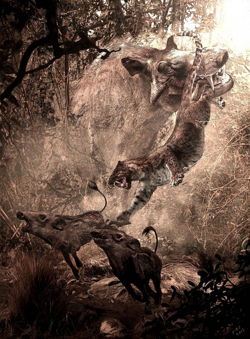 Velizar Simeonovski tarafından çizilen bu muhteşem resmin adı "Annenin Hiddeti". Çizimde, "cehennem domuzları" olarak da bilinen entelodonlardan biri olan Daeodon cinsi bir anne, yavrularını avlamak üzere atılan Dinictis cinsi antik bir etçilin saldırısını bütün hiddetiyle savuşturuyor. Gerçekten muhteşem bir sanat eseri: