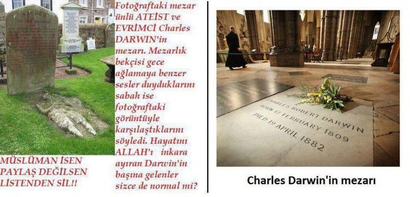 Fotoğraftaki mezar ünlü ateist ve evrimci Charles Darwin'in mezarı. Mezarlık bekçisi gece ağlamaya benzer sesler duyduklarını, sabah ise fotoğraftaki görüntüyle karşılaştıklarını söyledi. Hayatını Allah'ı inkara ayıran Darwin'in başına gelenler sizce de normal mi?