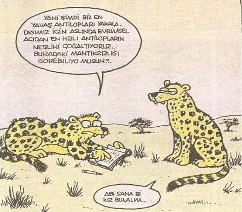 Dolayısıyla burada, şahsi tercihlere dayalı Yapay Seçilim'den söz etmemiz mümkün değildir. Av-avcı ilişkisi söz konusu olduğunda, hayatta kalma mücadelesine dayalı Doğal Seçilim'den söz etmemiz gereklidir. Karikatürün değindiği nokta bu açıdan ele alındığında, anlaşılır hale gelmektedir: Her ne kadar sürekli "avcıların gözünden" bakmaya alıştıysak da, evrimsel süreçte avların eli "armut toplamamaktadır". Karikatürün bahsettiği gibi çitalar, sürekli olarak (ister istemez) en yavaş olan avları avladıkça, bu avların popülasyonları nesilden nesle giderek güçlenir, zekileşir, hızlanır, çevikleşir. Öte yandan, avcılar üzerinde de eleyici bir seçilim baskısı bulunmaktadır: avcılar arasından da sürekli en uyumlu olanlar daha fazla avlandığı, diğerleri ise o kadar fazla avlanamadığı için, en güçlü, çevik, zeki olan avcılar hayatta kalır ve çoğalırlar. Yani evrim mekanizmaları, sadece avcılardan yana çalışmaz. Avlar içerisinden de en uyumlu ve başarılı olanları hayatta kalır ve ürer. Ancak bu ne zamana kadar böyle devam eder?