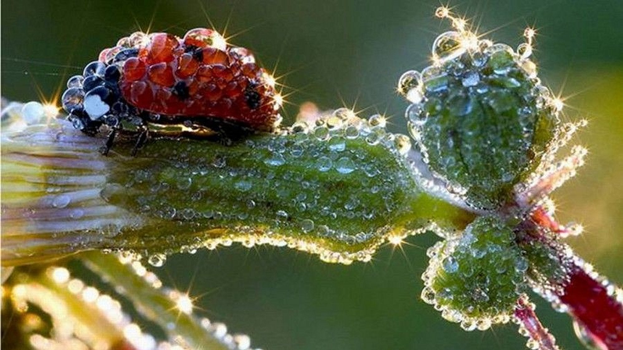 Yukarıdaki fotoğrafta, bir uğurböceği (Coccinellidae ailesi bireyi) bu çiyin etkisi altında su damlaları içerisinde kalmış ve bu fotoğraflanmış.