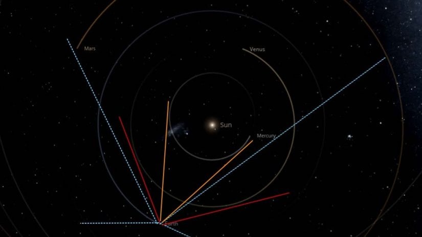 Görselde bütün çizgiler Dünya'dan diğer gezegenlerin yörüngelerine çizilmiş. Turuncu çizgiler Merkür'ün yörüngesinin sınırlarını kapsıyor, kırmızı ise Venüs'ün ve mavi kesikli çizgiler ise Mars'ın. İlk dikkat çeken şey, Mars'ın her yöne, 360° boyunca yayılan bir yörüngesinin görünmesi. Fakat Merkür'ün ve Venüs'ün bir açıyla sınırlandırılmış durumda. Bu durum şunu ifade eder: Merkür ve Venüs, gökyüzünde Güneş'ten daima belirli bir uzaklık aralığında bulunur, daha ötesine gidemez!