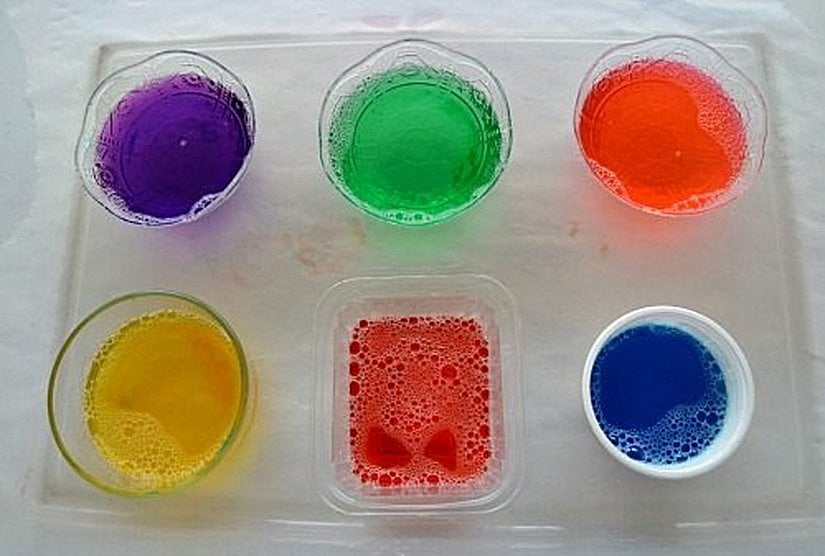 2. Üzerine birkaç damla farklı renklerde renklendirici damlatarak istediğiniz renkleri verin. Bu işlemler sonucunda kaplarınız aşağıdaki gibi gözükecektir: