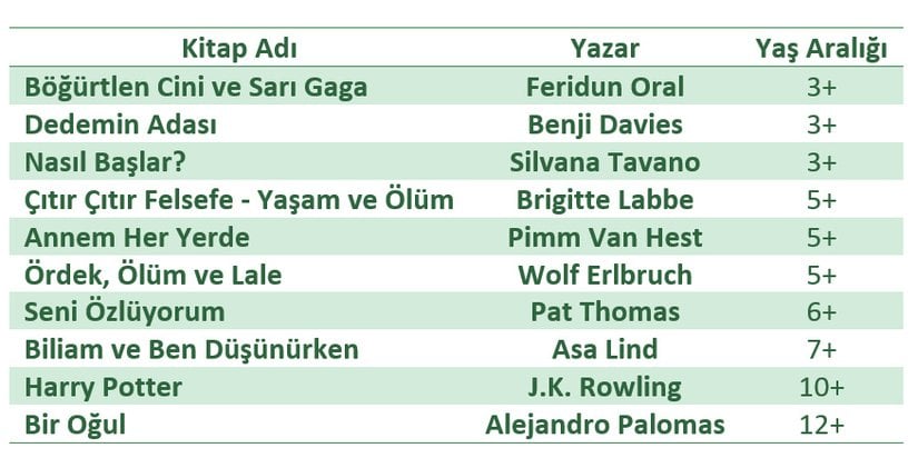 Kitaplar çocuklarınızla ölüm üzerine konuşmak için eşsiz fırsatlar yaratmanın yanı sıra, çocuklarınıza ölümle ilgili daha önce düşünmedikleri kısımların kapılarını da açar. Ayrıca doğru zamanda okunmuş iyi bir kitap, çocuğun ölümün yarattığı acıyı kabul etmesini de kolaylaştırabilir.