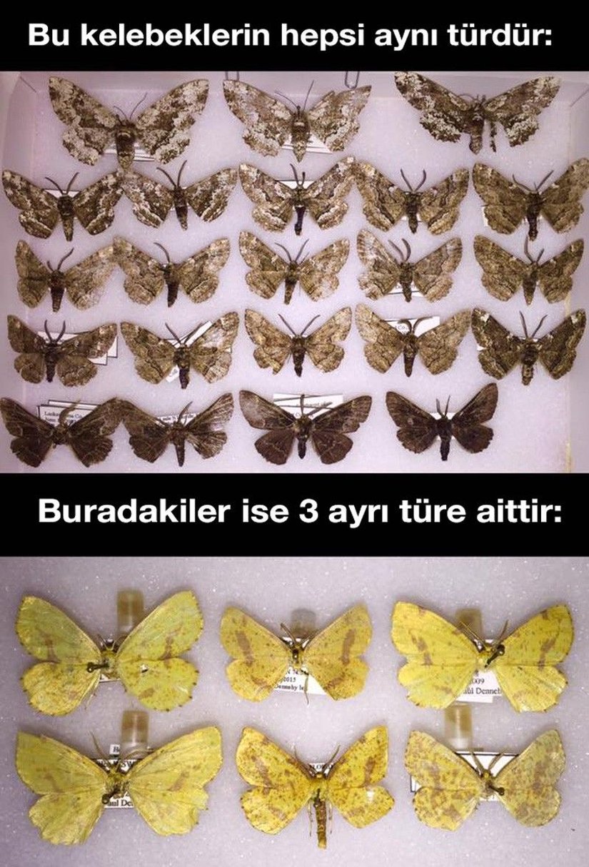 Daha sıra dışı bir örneğe bakalım: Aşağıdaki görselde, üst taraftaki birbirinden oldukça farklı gözüken kelebeklerin her biri aynı türün bireylerdir; sadece tür içi çeşitlilik dolayısıyla farklı gözükmektedirler. Alttaki birbirinin tıpatıp aynısı gözüken kelebekler ise aslında 3 ayrı türe mensuptur.