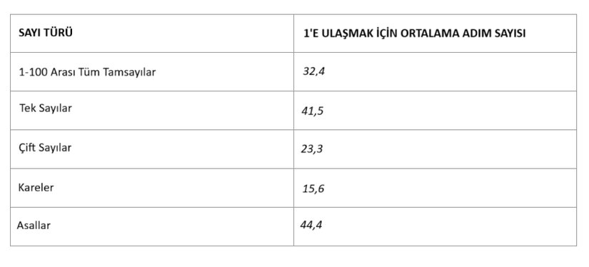 Yine çıkarılan bazı sonuçlara göre 2'nin kuvvetlerinin 1'e daha hızlı yani daha az adımla yaklaştığı fark edildi. Bu çalışmayla tüm pozitif tam sayılar düşünüldüğünde çok küçük bir kesit üzerinde araştırma yapılmış olsa da sayı türüne göre adım ortalamasını veren bir tablo oluşturulmuştur.