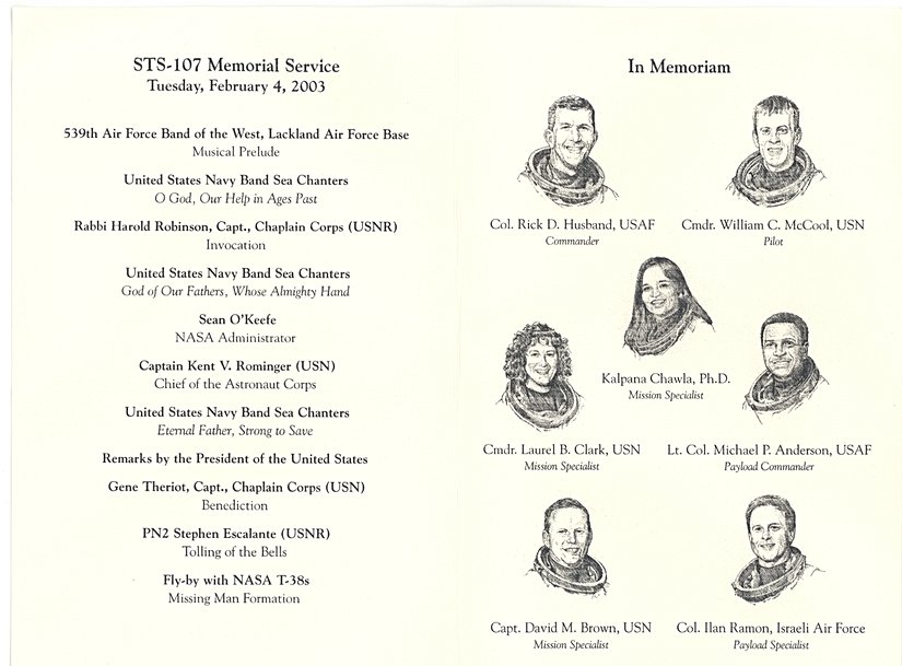 Bir gemi çanı Columbia mürettebatının her biri için bir kez olmak üzere yedi kez çaldı ve ardından dört NASA T-38 uçağı, kayıp mürettebat formasyonunda uçtu. Jetler alçaktan ve hızla ilerleyerek yerden 75 metreden daha az yükseklikte bir kama şeklinde bize doğru yaklaştılar. Jetler tepemizden geçerken, formasyonun sol tarafındaki ikinci jet, motorlarının gürültüsü üzerimize doğru gelirken, keskin bir şekilde yukarı doğru kalktı. Formasyon ilerlemeye devam ederken kayıp adam jeti yüksek ve düz bir şekilde kavis çizdi, şimdi artık aramızda olmayan kadın ve erkeklerin olduğunu fark etmemiz için bırakılmış boş bir nokta vardı.