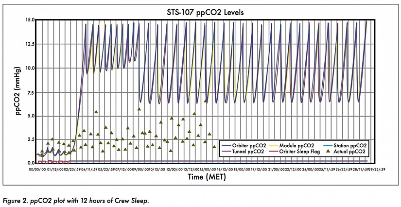 Mürettebat, bu düşük aktivite oranını sürdüremezse, NASA uçuş operatörleri CO2 içeriğinin 26,6 mmHg kısmi basınca (kabin hava hacminin yaklaşık yüzde 3,5'i) yükselmesine izin vermenin "mürettebat üyelerinin sağlığı üzerinde uzun vadeli bir etki yaratmayacağına" inanıyordu. Bu, mürettebatın daha "normal" bir 16 saate 8 saatlik uyanma/uyku döngüsünde çalışmasını sağlayacaktı; ancak bu, potansiyel olarak bazı fizyolojik eksikliklere mal olacaktı: baş ağrısı, yorgunluk ve yüksek CO2 seviyelerine bağlı diğer sorunlar çok hızlı bir şekilde ortaya çıkmaya başlayacaktı.