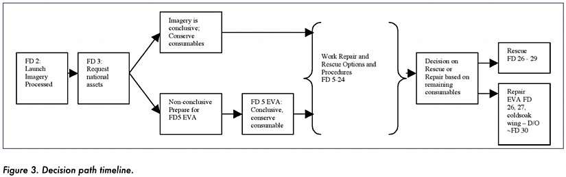 STS-107 uçuşu sırasında alınan kararları bir perspektife oturtmak için Kurul, NASA'dan STS-107 mürettebatının güvenli bir şekilde geri dönüşü için seçenekler olup olmadığını belirlemesini istemiştir. (Columbia Kaza Araştırma Kurulu Raporu)