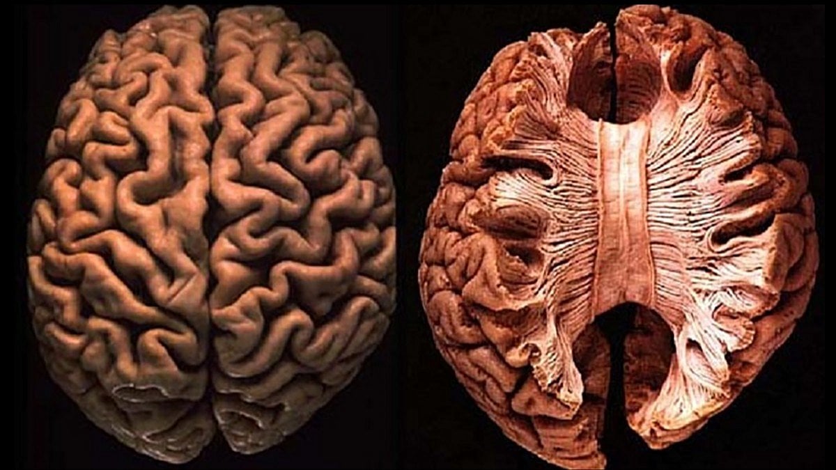 Fotoğrafta sol tarafta gördüğünüz, beynimizin üstten görünüşü. Sağ tarafta gördüğünüz ise, onun kabaca orta eksene kadar kısmen kesilmiş bir görüntüsü. İki beyin yarımküresini birbirine bağlayan yoğun sinir ağlarının ismi ise "corpus callosum", yani "zorlu gövde"dir. Bu karmaşık bağlantı, keseli memeliler haricindeki bütün memelilerin (Eutheria kladının tamamının) beyninde, korteksin hemen altında, uzunlamasına yarık boyunca bulunmaktadır.