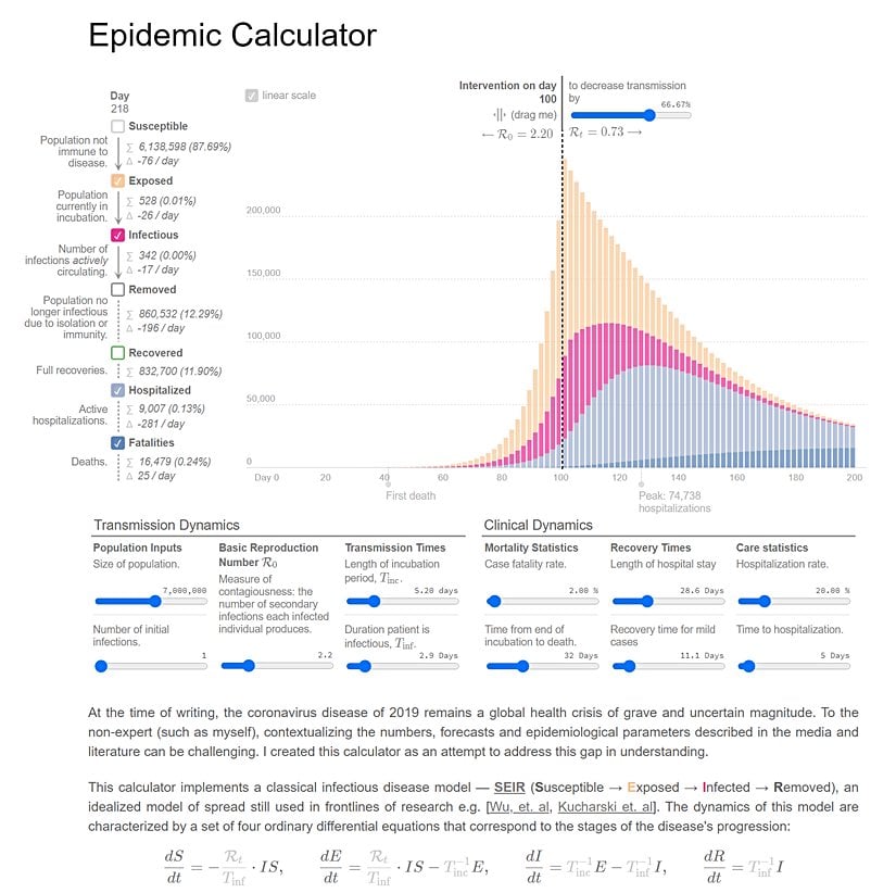 Genişletilmiş bir SEIR modeli kullanarak salgının farklı parametreler altında nasıl seyredeceğini görmenin en güzel yollarından bir diğeri ise, OpenAI araştırmacılarından Gabriel Goh ve ekip arkadaşları tarafından hazırlanan Epidemi Hesaplayıcı. Akademik makalelerden gelen matematiksel bir altyapıya dayanan bu hesaplayıcı sayesinde, çok sayıda parametreyi bir arada analiz ederek, bir salgının belli şartlar altında nasıl davranacağını öğrenebilirsiniz.