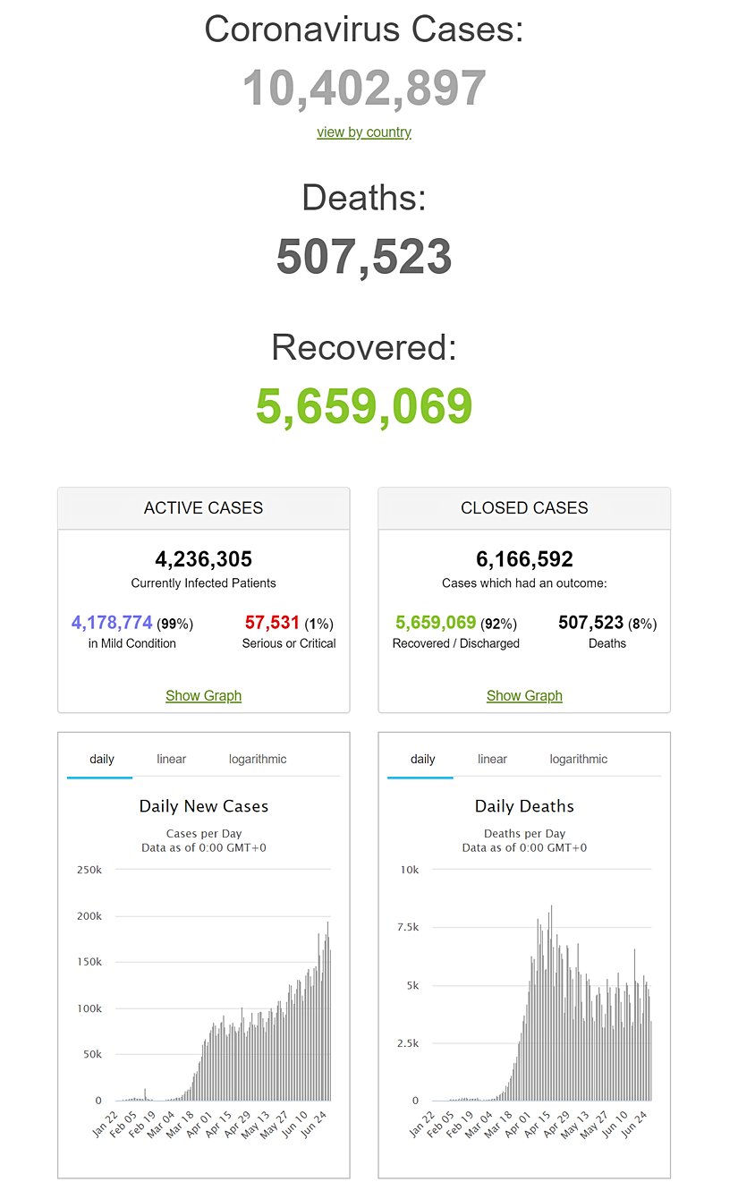 COVID-19 salgını bütün hızıyla devam ediyor. Bizim de haftalardır uyardığımız ve Dünya Sağlık Örgütü'nün 29 Haziran 2020'de yaptığı açıklamanın da vurguladığı gibi, "salgında en kötüsünü henüz yaşamadık". Bunu, COVID-19 testi ve antikor testi verilerinden net bir şekilde görmek mümkün. Dünya'nın henüz önemsenmeyecek kadar ufak bir kısmı (yaklaşık %1'i) hastalığa yakalandı ve daha şimdiden yarım milyondan fazla ölü var. Hastalığı durduramazsak, milyonlarla ifade edeceğimiz ölü sayıları çok uzakta değil.