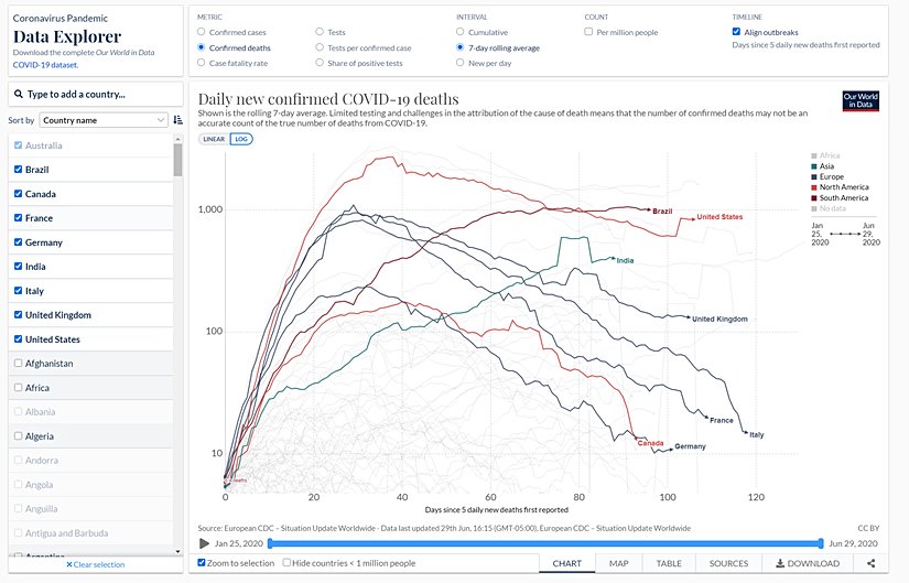 Dünya'yı veri ışığında anlamlandırmaya çalışan en büyük bilim girişimlerinden birisi olan Our World in Data, COVID-19 için de özel bir veri analiz sayfası hazırladı. Bu sayfa üzerinden ülkeleri farklı metriklere göre birbiriyle kıyaslamanız ve gidişatı analiz etmeniz mümkün. Ayrıca Our World in Data, Dünya Sağlık Örgütü verilerini gün gün kontrol ederek belirli tutarsızlıklar tespit etmeyi başaran ve bu nedenle ECDC verilerinin daha güvenli olduğunu tespit eden ilk oluşum oldu.