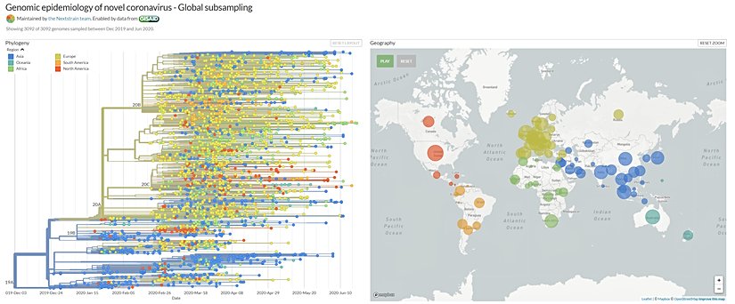 Diğer siteler arasında biraz daha "akademik" kalan Nextstrain, GISAID'e girilen SARS-CoV-2 virüs genomlarının evrimsel akrabalık ilişkilerini, biriken mutasyonları ve evrimsel yolaklarını takip eden çok önemli bir site. Siteyi kullanarak, COVID-19'a sebep olan virüsün farklı soy hatlarının filogenisini yakından takip edebilirsiniz.