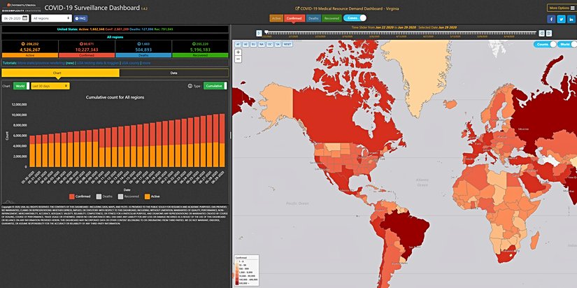 John's Hopkins'e alternatif olarak, farklı biçimlerde veriyi sunan üniversitelerin başında Virginia Üniversitesi geliyor. Hazırladıkları özel panelde, sadece genel verileri görmekle kalmıyorsunuz, aynı zamanda bir "zaman çizelgesi" olarak da salgının gidişatını harita üzerinden izleyebiliyorsunuz.